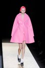 It was basically a two-dimensional collection that Comme des Garcons sent out yesterday.A play with volume, color and pattern. The first model that stepped at the basic, unfinished plywood catwalk wore a bright red coat, big and bold when viewed full frontal and flattened in profile. Next came another coat, in pink, later a pink-and-blue circle frock. The show was an explosion of outsized graphic precision and vibrant color. With their their bright plastic helmet bobs atop clothes cut big and flat, the models looked like paper dolls.