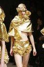 Looking at the location, the finale of the show and the hair of the models, Rei Kawakubo of Comme des Garcons chose gold as the new color. But that conclusion was made after the ‘Hybrid fashion’ she presented: from the front a coat looked like a python trench but from the back it were frilled shorts. Or from one side an outfit looked like a schoolboy jacket and pants and from another perspective it was a silk blouse with a sheer front.