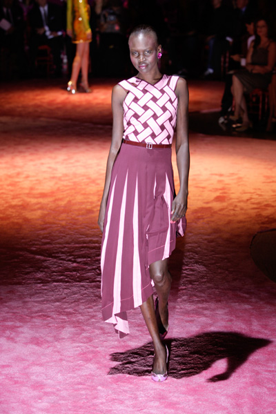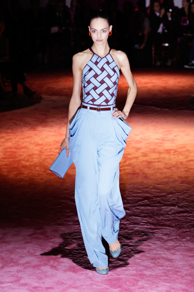 Zac Posen’s collection looked youtful and a fun to wear. The designer seemed to be inspired by the late seventies New York woman and the clothes had the attitude of a partygoing good-time girl. Posen pushed a color story and did so with colorblocking for day: chalky pink, yellow and purple on structured dresses, some with cutouts at the waist, and see-through raincoats worn over Pop Art geometric prints. That Mod-ish flavor and kitsch factor was quite charming, but some will not be easy to sell. Posen’s prints were beautiful, the bold florals were custom designed by NYC artist Rosson Crow. Posen put them on kicky pleated skirts and sexy cocktail dresses draped and cut to show skin at the shoulders and back.
