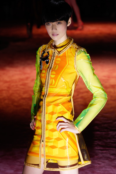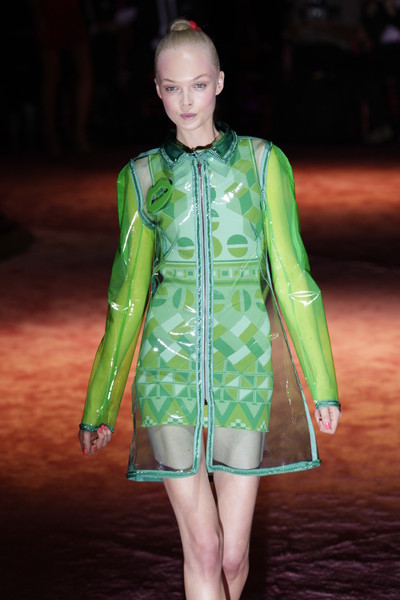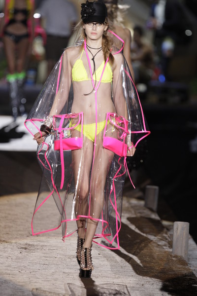 Michael Kors used the plastic for his bathing suits and bracelets. Out of everything we saw the most fantastic plastic was made by Frankie Morello. He came up with a chique Chanel-looking plastic jacket, which had collar and cuffs made out of fabric.
