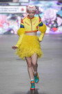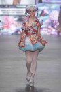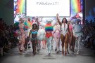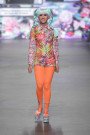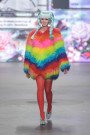 We have to miss Bas Kosters’ spectacle fashion shows this season, but tonight’s MaryMe-JimmyPaul collection was a nice surprising alternative. The designers presented an interactive show as the closing act of this Amsterdam Fashion Week opening night. Sponsored by Vodafone so phones were included in the interactive part. The audience was able to live vote for the looks while they were going down the runway. Doll-like dressed up models with pastel shades wigs and heavy make-up playfully walked the catwalk. They were dressed to the extreme sporting high heels, knee high boots, printed suits and spectacular fluffy/fur-like dresses and tops. With every look the outfits became more colorful, platform shoes got higher and the audience wilder. After the last look; the most hated and most loved models re-appeared. The finale for sure put a smile on everyone’s face when ‘ the designers’ were brought on stage and turned out to be two very tanned, strong bodybuilders in bikini. Bas Kosters too gave his sign of approval by enthusiastically applauding from the front row. What a spectacle; Amsterdam Fashion Week is officially started now!