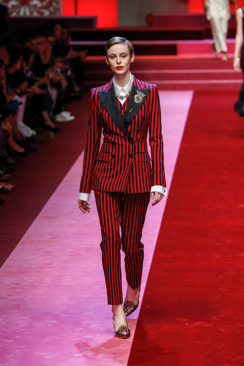 Never though you’d be wearing a suit off duty? Think again. This summer you’re bound to suit up for just about any occasion given the fact that this business chic look comes in many different options. From pastel colored (Victoria Beckham, Gucci, MaxMara) and striped (Dolce & Gabbana, Emporio Armani) to denim (Dior) and extra vibrant (Versace, Marc Jacobs). Have your pick and start casualizing (if that was ever a word). Just add sneakers, a fanny pack, brooches (Dries van Noten), a beret (Dior), a good pair of sunnies (Gucci) as well as a good pair of loafers (Galliano) and you can go from desk to dinner (or dawn). Office proof meets street chic. Let’s suit up for summer!