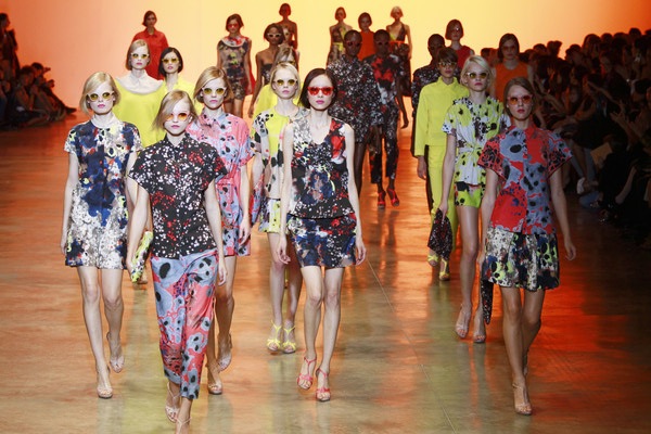 Sweet bubblegum colors and papery fabrics gave the Cacharel-collection a young and sporty energy. The prints were innovative: blurred florals and blotches in neon-shades gave it all an otherworldly edge.
