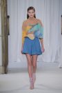 Lak made everything look and feel soft — the (degradee) colors, the fabrics, the shapes. The hues melted into each other. Silhouettes came in fluid satin drapes and swirls, and furs — real and faux — added plush texture. The clothes don’t fall in line with any trend. Here, the looks had something in common with draped modern dance dresses cut with lots of movement. A spare jumpsuit topped with a fur stole would have qualified as minimal if not for its bell sleeves and bell-bottom legs. Shift dresses wrapped in tulle around the shoulders were pretty, interesting but not too out there, and there were lots of great coats — teddy bear furs and a holographic trench.