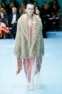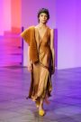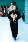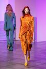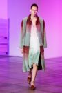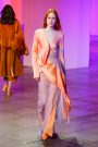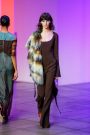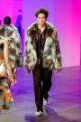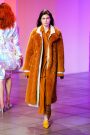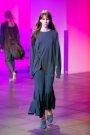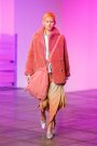 Lak made everything look and feel soft — the (degradee) colors, the fabrics, the shapes. The hues melted into each other. Silhouettes came in fluid satin drapes and swirls, and furs — real and faux — added plush texture. The clothes don’t fall in line with any trend. Here, the looks had something in common with draped modern dance dresses cut with lots of movement. A spare jumpsuit topped with a fur stole would have qualified as minimal if not for its bell sleeves and bell-bottom legs. Shift dresses wrapped in tulle around the shoulders were pretty, interesting but not too out there, and there were lots of great coats — teddy bear furs and a holographic trench.