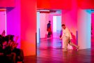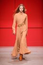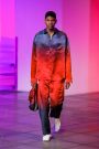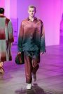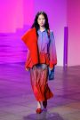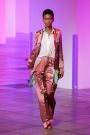 Sander Lak drew his audience during his show into a dream world of light and color that morphed from one tone to another.The room was bathed in blue, pink, purple and red lights that intensified the collection’s unusual palette — teal, sage green, brown and ombréd peach and ice blue, red and dusky blue. It looked beautiful, upbeat and very feminine.