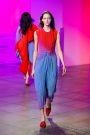 Color combinations were offbeat, with some working a treat, as in a marine blue A-line dress with a bright yellow collar, a long cinnamon coat with a pale blue flower belt, and a pink dress with feather-light red tulle panels at the side.