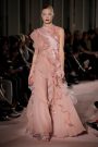 Tomas Maier – the designer of Bottega Veneta, decided to present the fall-collection in New York because of the opening of a flagship-store in the Big Apple. Maier’s color-palette worked the wearable side of flamboyance — marigold, wine, purple and his silhouettes shunned citified cliché. He opted for relaxed shapes and intense surface interest. A skirt was embroidered with a demonstrative, artisanal riff on the cube motif. A dress featured two overlays of fabric cut away into geometric motifs; another contrasted shiny and velvet sequins. Fine outlines on dresses and skirts that at first glance looked like stitching were actually delicate chain embroideries.