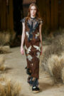 Currently, outerwear is king. Shearlings were distressed with raw edges and floral and eagle embroideries all over. Vevers pushed the shearling idea even further with a dyed hoodie style with intarsia floral designs and a full-length topper coat that was dyed several shades of brown.