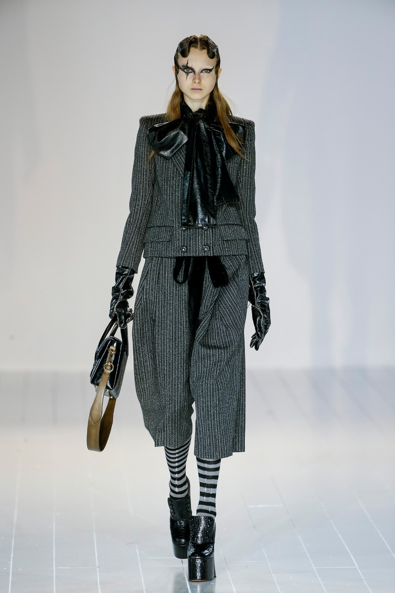 The skirt suit sure made a cute comeback last year. Yet for fall the suit is kicking back big time. We’re heading back to work in some of the most striking suits. We’re spotting long suit jackets at Balenciaga, Bottega Veneta and Gucci. While Sonia Rykiel and, the ultimate office attire provider, Armani are going for something shorter. And if there’s one way to summarize all suits it is by stating anything and everything is possible. Office proof in a purple velvet number including a skinny scarf (Bottega Veneta)? Or business chic in a pair of culotte pants, matching jacket and enormous velvet bow (Marc Jacobs)? Or why not skip that bow and scarf all together and opt for something way more seductive, like that grey suit jacket worn with a pair of pinstripe pants (Max Mare)? And you know in an outfit like that it’s a small step from desk to dancefloor. You’re 9 to 5 wardrobe rack just got a whole lot more versatile.