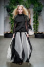 “With this collection I want to create peace in all chaos that surrounds us and shows the beauty that is still there”, explained Merel Glabbeek. Dark and moody was the vibe at her show. Starting with the loud desolate and gloomy music, ending with the black confetti falling from the ceiling, creating the right balance between structure and chaos. In between we were presented with a selection of nicely tailored long & lean looks. Wool jersey combined with materials like bamboo, canvas and lycra. With beaded embroideries that added to the luxurious feeling of the collection and gave the illusion of a new kind of fur. Shades of black, off white and pastel complemented the shapes of the fashion pieces. Unique, handmade pieces that together turned into collection ‘Hush’, defined by blended contrasts and strong, dark and feminine silhouettes. A collection that brought structure and chaos together.