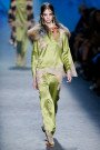Here was another transporting and hyper-feminine collection from Sarah Burton for Alexander McQueen. Dreamy gauzy dresses in knits as fine as cobwebs; tuberose flowers hand-painted on leather coats and corsets, and feathered skirts made of ostrich plumes that had been lacquered to give them a brooding aspect. The designer decorated her clothes and accessories with talismans and surreal symbols, including pocket watches, butterflies, horseshoes, lips and eyes.