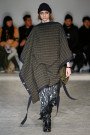 Micheal Kors’ show was all about function made special and chic — coats (and more coats), sweaters, pants and skirts. How everyday can it be? Kors opened with the basics — peacoat, white blouse, pullover and jeans, but the jeans happened to be feathered from the knees down. Camel made it onto the runway in a shawl-collared coat — a floral mink, worn over a sweater and cropped pant. Other coats got abundant fur collars or were cut in glistening floral brocades. An officer’s coat was sashed in mink. Another simple pleasure, knitted cashmere, came in a charcoal sweater-and-skirt duet that got the reality diva treatment with feathers. Kors kept his shapes from classic to retro.