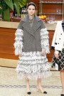 There was even a riff on workwear: short and long takes on waiters’ aprons (tweed or embroidered; never white) tied on over pants. Into the mix, Lagerfeld incorporated young, fresh trapeze LBDs; frou in black and white; and, in a pret-meets-haute moment, a huge triangle coat in a plain gray wool and jeweled feathers.