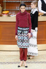 There were senses of both classic Chanel and classicism upended. Suits, some with blouson jackets, were crafted from puffed squares of paper-thin leather; others, in tweedy plaids, featured skirts with deep bias borders. But Lagerfeld also made a big show of sportif, as in separates, Chanel-style: patterned sweaters and skirts under glittering parkas; sweater, skirt; cardigan layered over classic jacket and jeans; V-neck pullover stretched into a sweater gown.