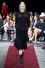 Designer Phoebe Philo tried to explore the fine line between the idea of sexuality and sensuality and translated that into the Céline-style. She opened with a sweater with belled cuffs covering the hand over wide pants in what looked like embroidered crocheted lace. The fabric would recur in a jacket over pants and a dress, all chaste of silhouette but revealing of skin via random devoré windows. Philo also did a turn with lingerie, corsets undone and deconstructed over slipdresses and deliberately ill-fitting conical bras. Sweater dresses covered up in front flashed circular, open portholes in back.