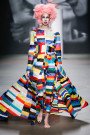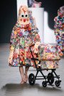 If there’s anyone who knows how to throw a decent catwalk party, it’s Bas Kosters. Year after year he gets the fashion crowd going by just letting music, make-up, backdrop and models in his designs work together. Today was no exception. Bas himself sat on a large block which stood on the catwalk. In Lotus position, like a fashion Budhha he looked at the fashion crowd. As he started spinning, yep, spinning, we’re talking Bas Kosters here, Valentijn de Hingh, opened the show. Naturally dressed in a bright colored, larger than life creation. As the show went on all typical ingredients came along. Tulle, bright colors, structured shapes, glitters everywhere, make-up overdone. Oh and let’s not forget the customized strollers, supermarket carts, dolls and Bas’ face as a backdrop. The music was a little less party, a little more spiritual. Incense and flowers spreading the love during the finale added up to that relaxation factor. An awakening and enlightening start of the weekend. Thanks for a good time, Bas!