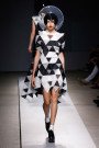 Junya Watanabe never designed for the mainstream client, but his collection for spring was more extravagant than we’ve seen from him in a while. Cartoonesque figures strutted his runway, sporting bright colored, latex disc shaped clothing, shoes helmets and bright make-up to match. The silhouette, if there was any, was about bare legs and architectonic shapes. Round discs at the shoulders, 3D, origami-like effects on the tops, asymmetric, zipped skirts at the bottoms. Breton stripes and biker jacket influences referred to the designer’s signatures. Other than that it was hard to recognize real wearable pieces. Most looks were real show numbers, belonging in a fashion expo or on stage. Both Gaga and Minaj would be pleased to pull some performance pieces from this collection.