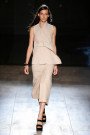 Creative Director Josep Font of the Spanish house Delpozo played with volume, proportion and illusion. He began with exaggerated sportswear silhouettes: the widest of red culottes paired with a white wrapped bandeau, and the fullest of skirts, beautifully done in a white, navy and green midi strapless dress with a white shirt underneath. He then shifted gears into more sculptural pieces inspired by the land art of Nils-Udo, including a yellow top with an exaggerated peplum and a sculpted flower on the bodice, and a miniskirt with origamilike panels.