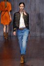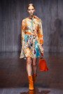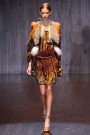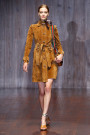 At Gucci we were presented a mix of many things really. A mix of luxury and casual, sensual and practical, western and eastern influences, but also a combination of vintage inspired and more modern pieces. Overall the collection had a seventies vibe, which perfectly coincides with Kate Moss – Gucci’s front row guest – being the new face of the brand. The topmodel is known for her seventies rock chic way of dressing. She loves a good pair of jeans as much as she adores her many fur creations. We therefore could see her working the biggest part of the collection into her daily wardrobe. The army inspired, double breasted jackets while on the go in London. The XL laced up tops while lounging on a yacht near Saint Tropez. The patchwork, Oriental printed chiffon dresses when attending a fancy fashion event. The 7/8 pants might be a little more tricky, as they would be to any average woman’s figure. Same counts for the stiff, thick leather designs that mostly just look their best on a model’s body. But Frida came up with more than enough wearable options for next summer. The gorgeous color palette of browns and reds definitely set the right mood. The accentuated waists (by brown leather belts) and silk scarfs added to the cohesiveness of the collection. And as strangely as it might sound, we’re looking forward to rocking some of that fur underneath the Ibiza sun.